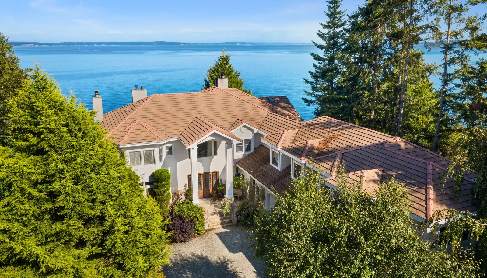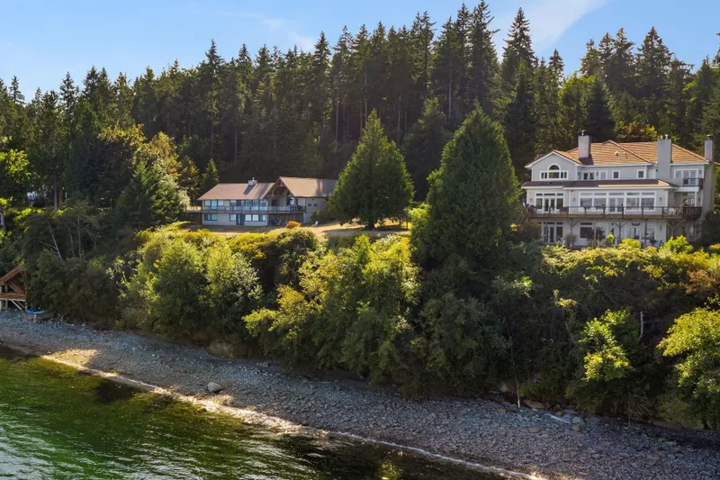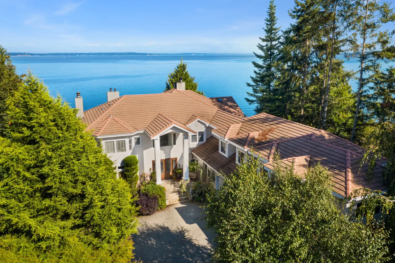 A captivating Puget Sound waterfront estate perfectly sited on 2.85 private acres with 125 feet of medium bank paradise and tucked away on a quiet bay with panoramic views of the Sound, Whidbey Island, and the Cascade Mountains.